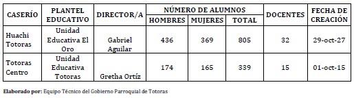 Las unidades educativas El Oro, Totoras e Insutec pertenecientes a la parroquia Totoras, son instituciones Fiscales que cuentan con educación básica y bachillerato de habla hispana. Son instituciones mixtas, tanto en estudiantes como en profesores y no cuentan con programas de alfabetización. Además los estudiantes han sido preparados por el programa “Escuela Segura”, donde sus integrantes colaboran precautelando el buen comportamiento estudiantil principalmente en la hora de recreo.