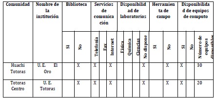Equipamiento disponible en las instituciones de educación en las comunidades de la parroquia Totoras